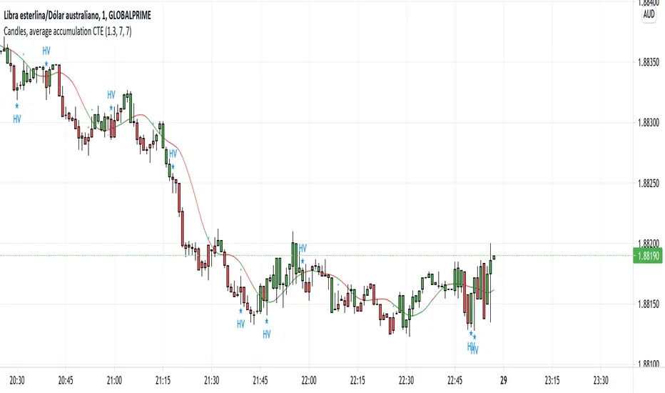 3- It shows us a smoothed moving average, acting as support or dynamic resistance, this moving average should be used as a complement for the volume analysis, for example, if the color of the last candle appears in a negative accumulation color then we must wait that has force in movement with the crossing of the moving average.