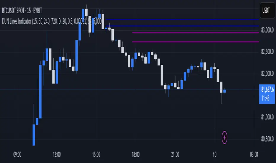 The DUN Lines indicator detects, filters and plots price imbalances (aka fair value gaps or fvgs/ifvgs). It is unique in the fact that it uses five timeframes and filters out overlapping, lower timeframe imbalances and fvgs below a user-definable size threshold.