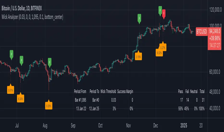 This indicator analyzes candle wick patterns and evaluates their outcomes over a user-definable range (default is 1 year). Labels are rendered on the chart to mark events that meet the specified wick condition.