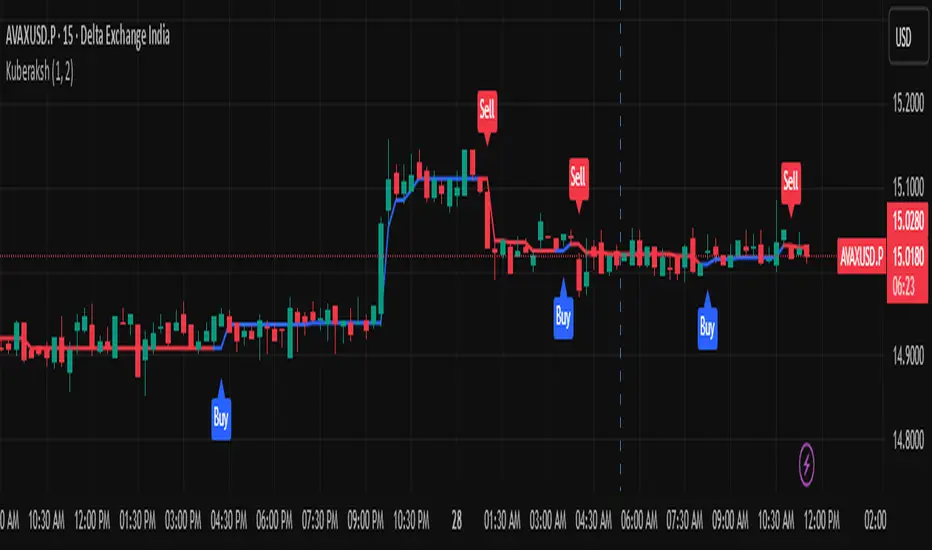 Kuberaksh is a dynamic, trend-following indicator designed to identify market direction and potential reversals with high clarity. Built on the core logic of the HalfTrend, this script provides traders with clean, actionable signals and visual confirmation of channel deviation.