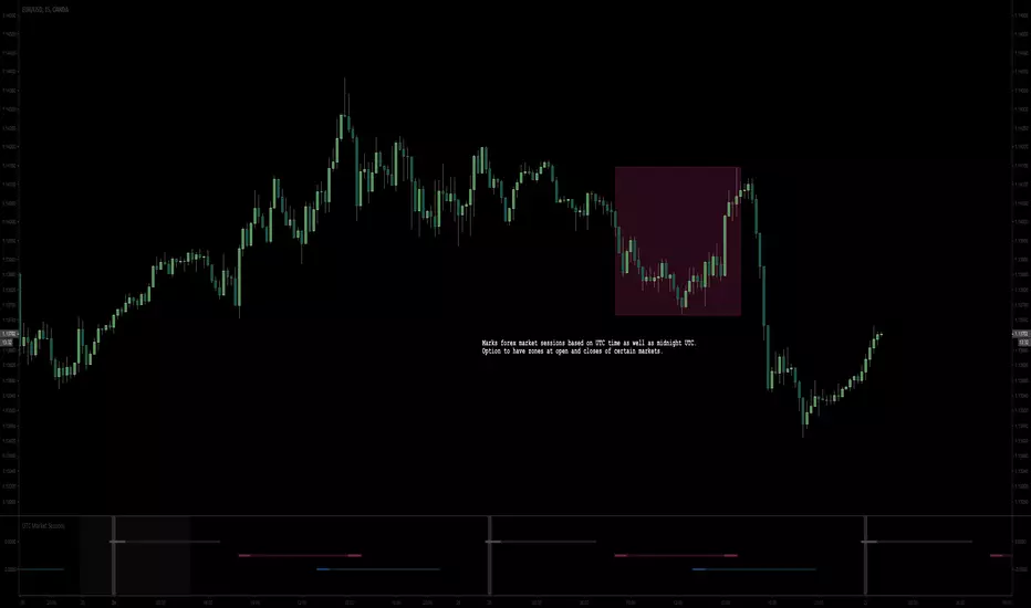 Explained on chart. Gives a UTC based market session marker. Can customize to your liking. The numbers a bit finicky - will be fixed in a future update but if you play around with them you can dial in to your liking.