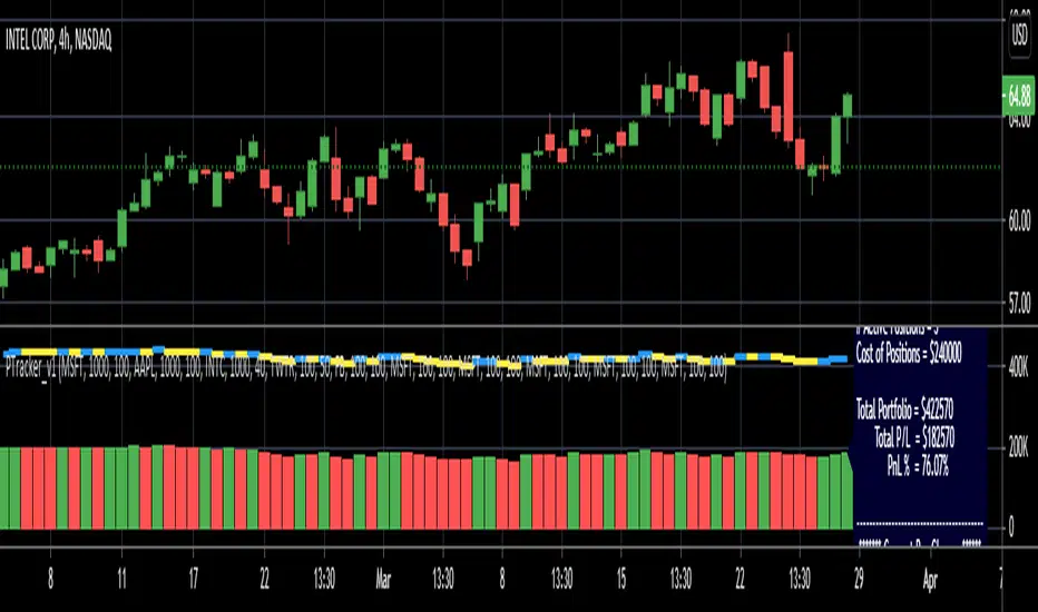So the simple idea is to track a portfolio of few positions and watch how the total portfolio and the PnL changes over time as the price of the individual holdings move up and down. it can be added to any chart.