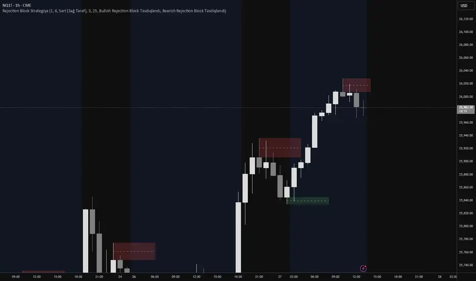 Rejection Block Strategy. This indicator draws rejection blocks on the chart based on the strategy explained by VerumTrader. You can use the default settings or change the settings.