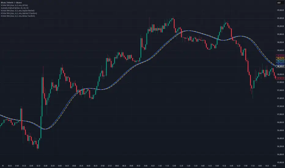The exponential moving average is one of the most fundamental tools in technical analysis, but its implementation is almost always locked to a single mathematical approach. I've always wanted to extend the EMA into an n-order filter, and after some time working through the digital signal processing mathematics, I finally managed to do it. This indicator takes the familiar EMA concept and opens it up to four different discretization methods, each representing a valid way to transform a continuous-time exponential smoother into a discrete-time recursive filter. On top of that, it includes adjustable filter order, which fundamentally changes the frequency response characteristics in ways that simply changing the period length cannot achieve.