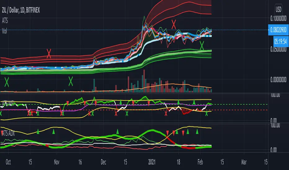 Aditionally a couple of bands are drawed around the Medium Length moving average in conjuction with the ATR to account for