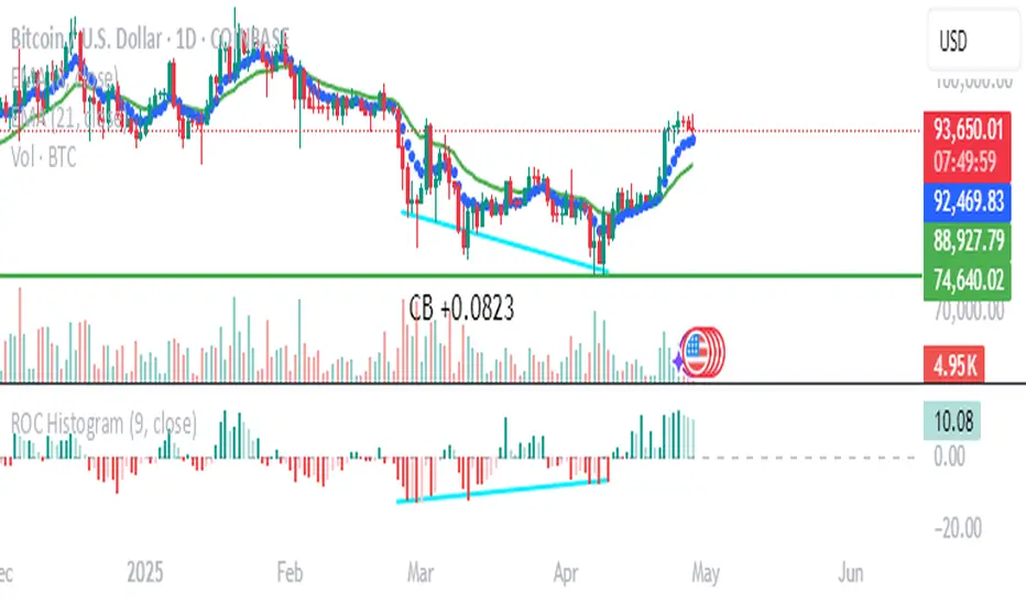 Implementation: Used the exact color logic and hex codes from the MACD code, applied to the ROC histogram. This highlights momentum ebbs (falling ROC, fading waves) and flows (rising ROC, strengthening waves).