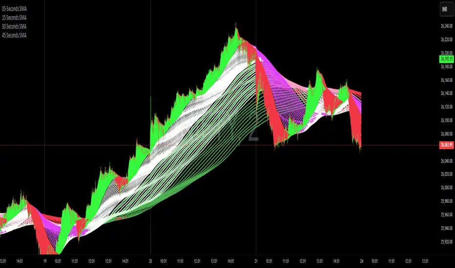Using multi-second, multi-timeframe Simple Moving Averages (SMA) — from 5 seconds up to 45 seconds with periods ranging from 30 to 900 candles — allows for an ultra-granular view of market microstructure.