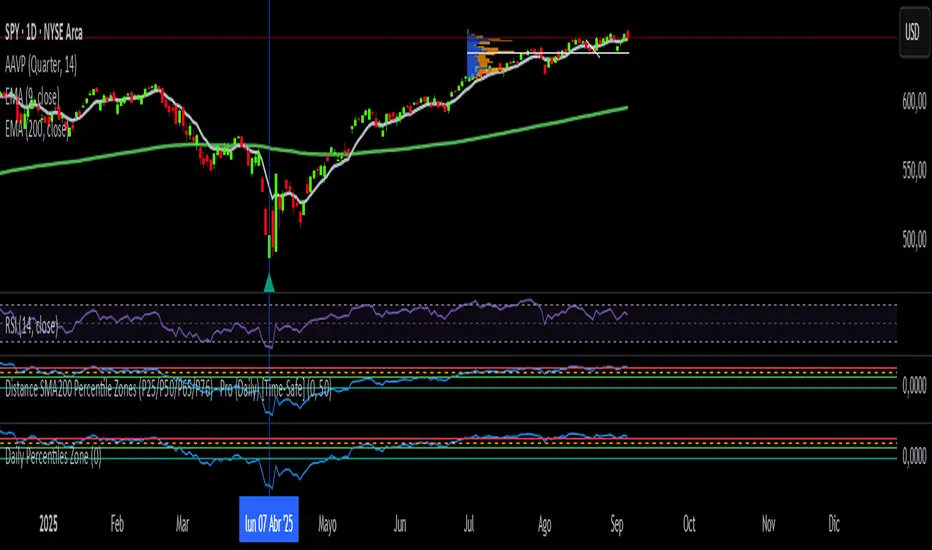 The SMA200 Distance – Percentile Zones indicator measures the percentage distance between the price and its 200-period Simple Moving Average (SMA200), and classifies it into historical percentile zones.