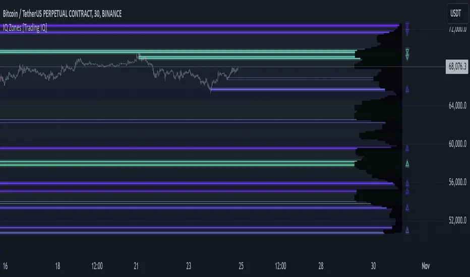 "IQ Zones" is an indicator that combines support and resistance identification with volume, the "value area" of a candlestick to be exact. IQ Zones identifies turning points in the market; however, the candlestick high or low that formed the key turning point is not necessarily distinguished as the support/resistance area. Instead, the script looks into the bar at lower timeframes and calculates the value area of the candlestick that formed the support or resistance level. Therefore, any lines protruding from a candlestick reflect the value area of that candlestick. These levels (value area high and value area low) are marked on the candlestick as a support/resistance level. If the level formed on high volume it's marked as an "IQ Zone".