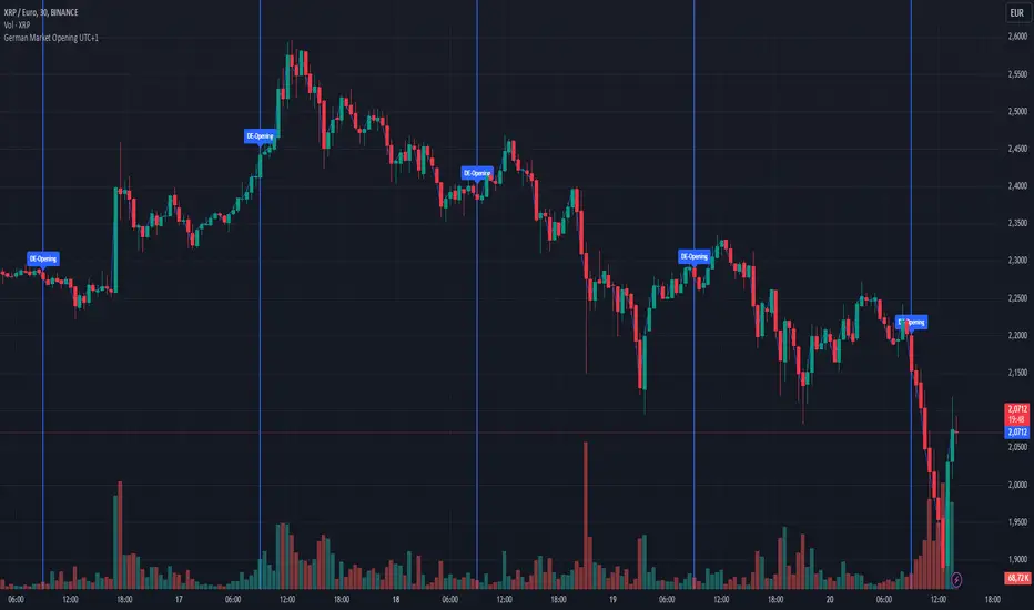 This script highlights the opening time of the German stock market (08:00 UTC+1) on a TradingView chart. It is designed to help traders quickly identify market openings and analyze price movements during this key trading period.