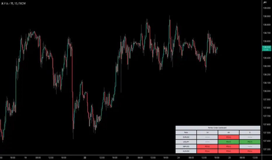 To identify perfect order across multiple currency pairs, I have developed the dashboard where you can see perfect order status from 3 timeframes; Daily, 4 hour and 1 hour.