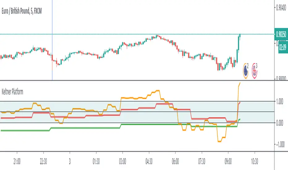 This script gives you the information on Keltner Channels in three or four different timeframes. I usually like to put the information from high-timeframe charts on the lower ones to see the bigger picture without switching. Keltner Platform gives you the idea of how far the price is from its moving average in the true range units.