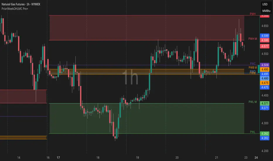 This indicator follows the standard prior-week methodology but adds the following original, professional-grade enhancements: