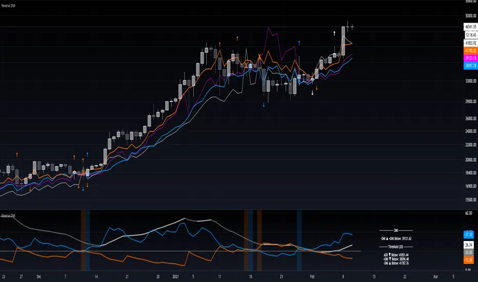 The Reverse DMI is in essence the same DMI or (Directional Movement Index) you all know and love with the addition of two reverse level features, and can be used to assist the end-user in their decision making for entry, exit and risk management.