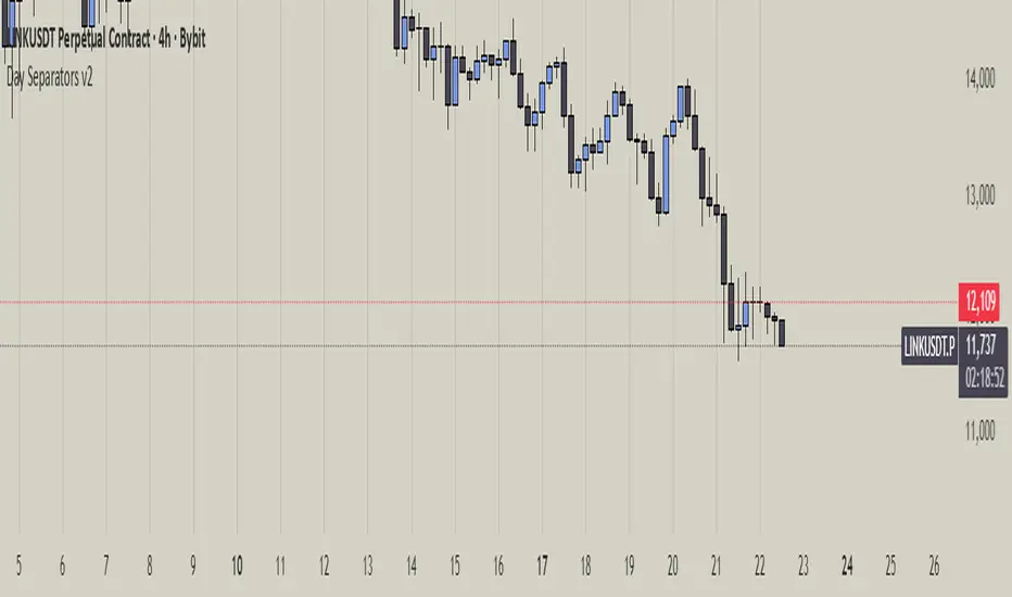 This script visually separates the trading chart by days of the week. Each day is highlighted with a distinct background color or vertical line, making it easier to analyze daily price patterns and trading activity. Useful for spotting trends, comparing daily performance, or planning strategies based on weekday behavior.