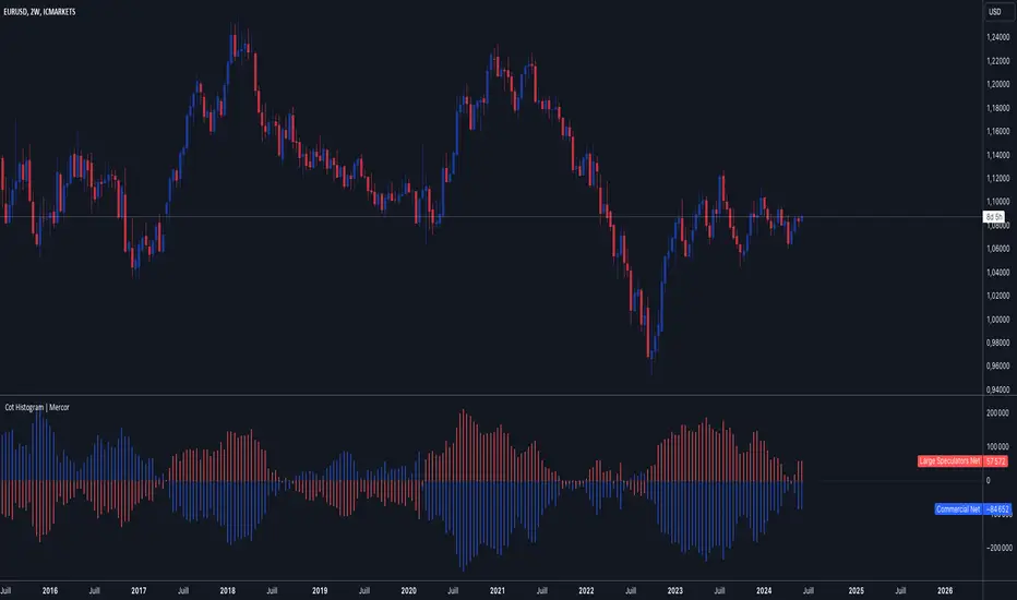 The Cot Histogram | Mercor indicator provides a comprehensive visualization of the Commitment of Traders (COT) report data using bar charts. This indicator is designed to help traders analyze the positions held by commercial traders and large speculators in various markets. By representing the data as histograms, traders can easily interpret the long and short positions, as well as the net positions of these market participants.