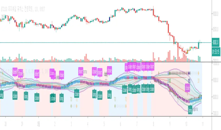 이 지표는 하이킨아시와 EMA로 트랜드를 분석하여 매수와 매도 진입을 하고 볼린저밴드와 캔들의 패턴을 분석하여 포지션종료를 합니다.