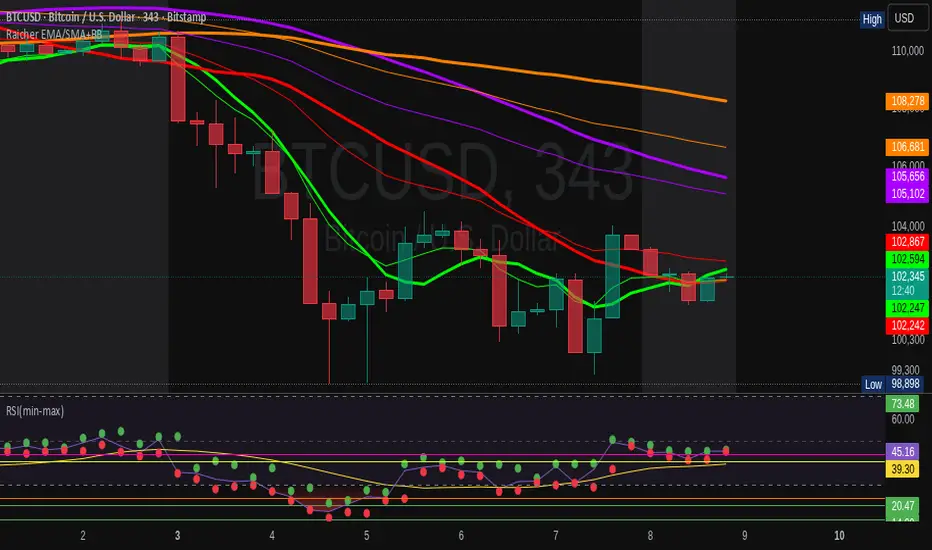 RSI (Min-Max) is an enhanced version of Welles Wilder's Relative Strength Index, designed to offer greater analytical precision and dynamic insight into the behavior of the RSI within each candlestick.In addition to displaying the traditional RSI value, this script calculates the possible extreme values — the minimum and maximum RSI — based on the low and high prices of the current candle. This allows you to estimate how the RSI would react if the price moved to the extremes of the bar, providing a predictive and refined reading of momentum.
