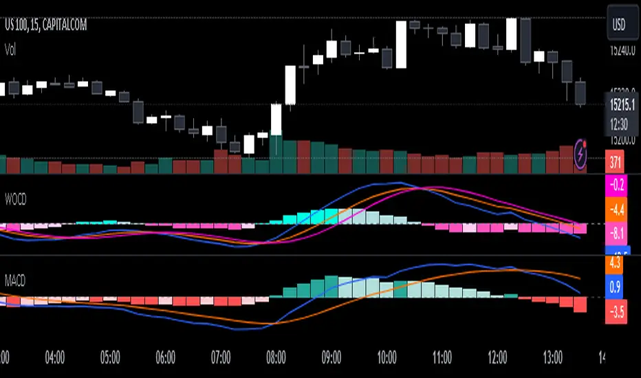 WOCD uses a 3-period High, Low, Close (HLC3) moving average to calculate the raw oscillator value, whereas MACD uses the difference between two exponential moving averages (usually 12-period and 26-period EMAs).