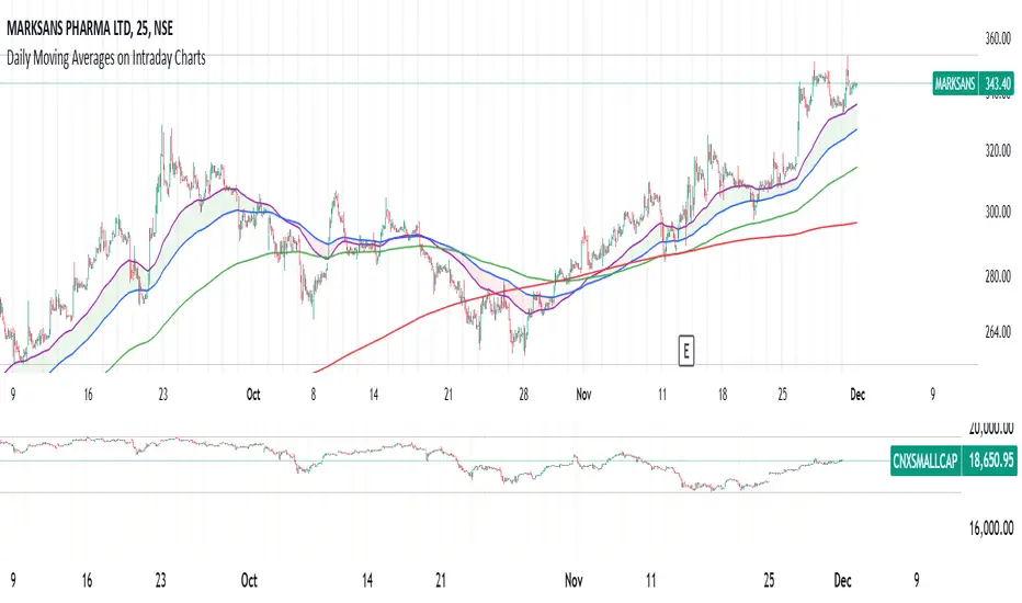 This moving average script displays the chosen 5 daily moving averages on intraday (minute) charts. It automatically adjusts the intervals to show the proper moving averages.