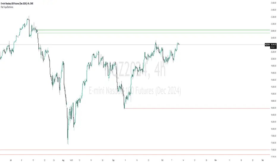 Flat Top/Bottom Candles are zones where price delivery didn't provide opportunity for manipulation representing an inefficiency that the market will seek to rebalance. Consequently, these zones can provide good targets for entries in the opposite direction or take profit targets for previous entries in the direction of the Flat Top/Bottom Candle.