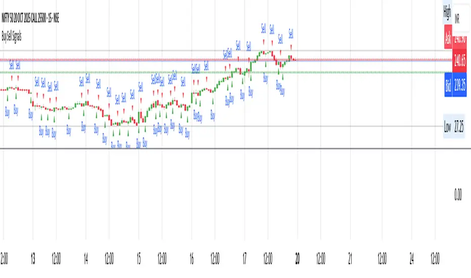 Conditions for Buying is Current candle a0 LOW = OPEN, b) Has a smaller wick than the previous cabndle size. Size here means high minus low of previous candle. More importantly Buy signal is genarated if the prious candle or series of candles were red. Condition for Sell signal is completely opposite of Buy signal. Buy signal will appear only after a Sell signal was generated earlier and vice versa for Sell signal. Signals are generated on a 5 minute timeframe. Idea is solely concieived by me.