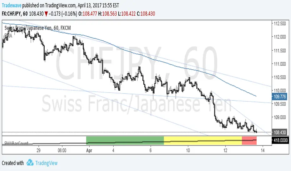 The indicator counts the total number of bars since a price touch of a target exponential moving average.