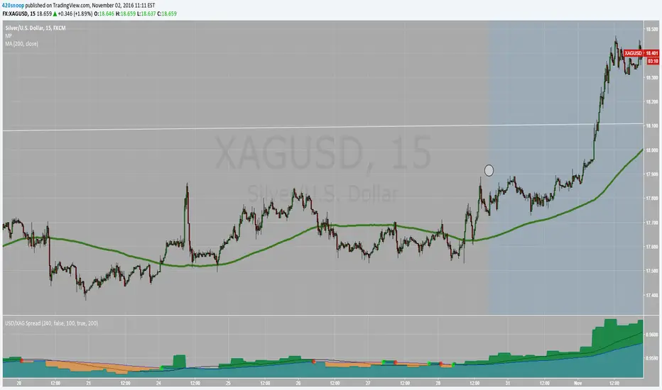 It is similar to what the original user /u/MarcoValente published for his gold/silver spread script; however I have made some changes so this is usable for XAGUSD and utilizes my 'holy grail' method of basket weighting the USD (aka why the code is protected) for comparison against silver and I also made some visual enhancements like color changes, filled area of interest, and crossover markings.