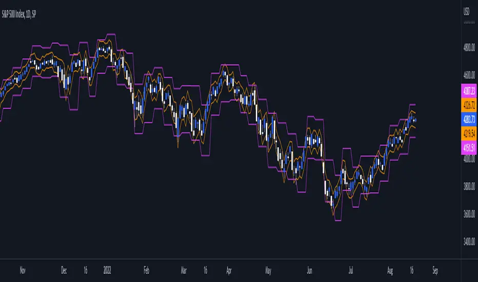 This indicator calculates the daily and weekly +-1 standard deviation of the S&P 500 based on 2 methodologies: