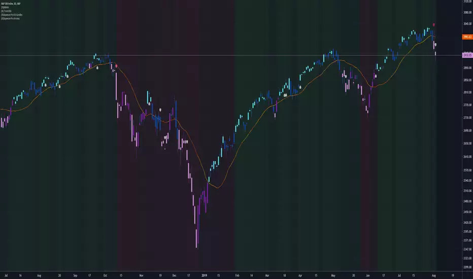 More Squeeze Pro continuation, this is the signals on the chart. Initial signals appear as small label up and label down icons, while if the squeeze continues to a certain interval a bigger icon will appear later in the same squeeze duration - they are all color coded to match the squeeze signals from the Squeeze Pro indicator
