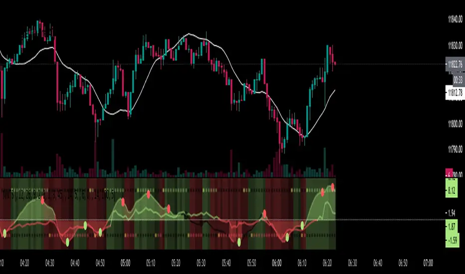 1. Baseline (trend line): I usually use "Regression Line" indicator that can be found in the public library. If the price is above the baseline, look for longs; if the price is below the baseline, look for shorts. This part cannot be included in this indicator since it needs the indicator to be an overlay indicator. So choose and couple with your own.