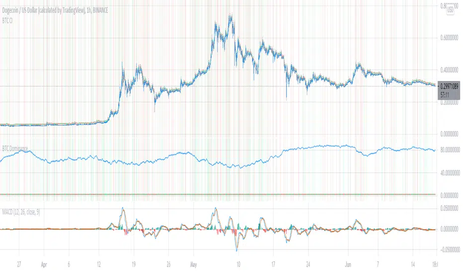 This script looks at BTC dominance in price-action and scores it (out of the last 100 closed bars). Essentially this looks at the price action of the current security/crypto and tracks whether it traded in-trend with BTC or against the trend with BTC to show when BTC is most prominently dominating.