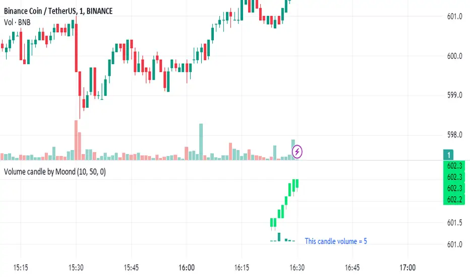 This indicator creates a real-time candlestick chart where each candle forms upon the completion of a specific volume threshold, rather than within fixed time intervals. The candles update dynamically based on the total volume traded, providing a unique perspective that incorporates market activity directly into price movements.