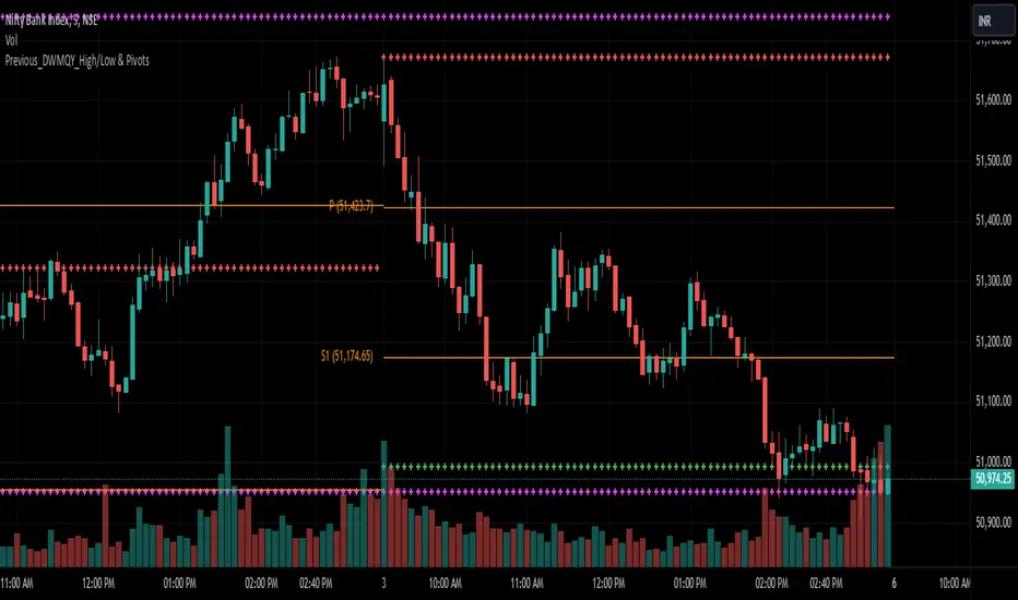 This script calculates high/low pivots for different timeframes (daily, weekly, monthly, quarterly, and yearly). You have various pivot point calculation methods (Traditional, Fibonacci, Woodie, Classic, DM, Camarilla) and have inputs that allow customization of the indicator. The script also accounts for custom year-based calculations (bi-yearly, tri-yearly, quinquennially, decennially).