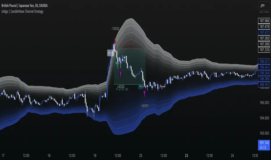The CandleWave Channel Strategy uses an exponential moving average (EMA) combined with a custom true range function to dynamically calculate a multi-level price channel, helping traders identify potential trend reversals and price pullbacks.