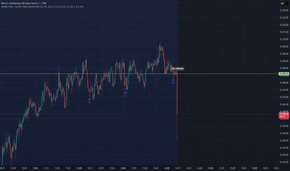 This indicator combines Auction Market Theory with Volatility Regime Detection to classify the current market state and highlight key auction events.