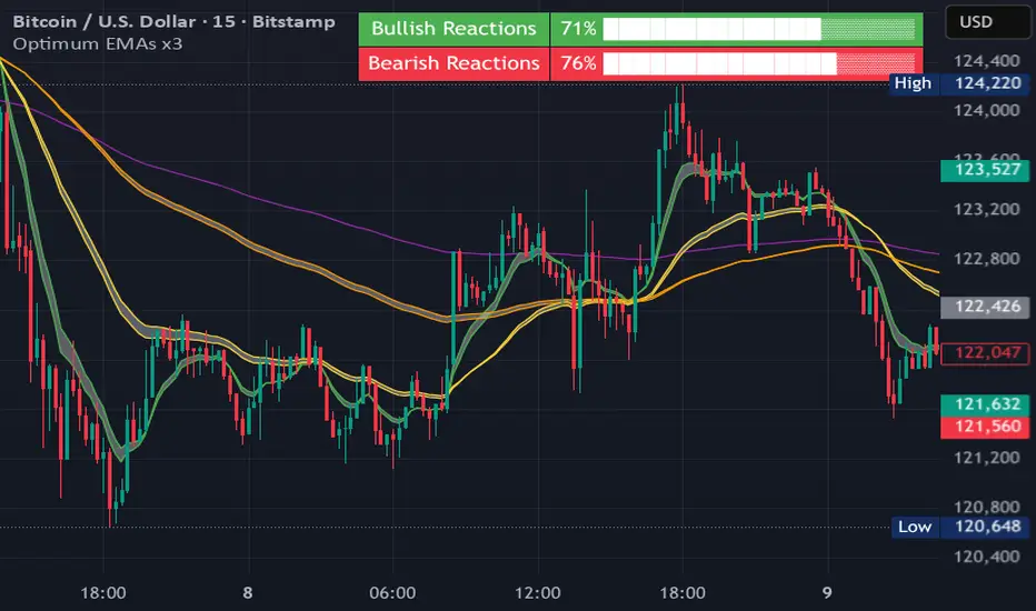 Optimum EMAs x3 scores EMA-price reactions via bullish/bearish percentages. Plots test (purple), bull/bear fast/medium/slow EMAs with toggles/individual colors, three adjustable gradient fills, and reaction table for multi-band analysis.