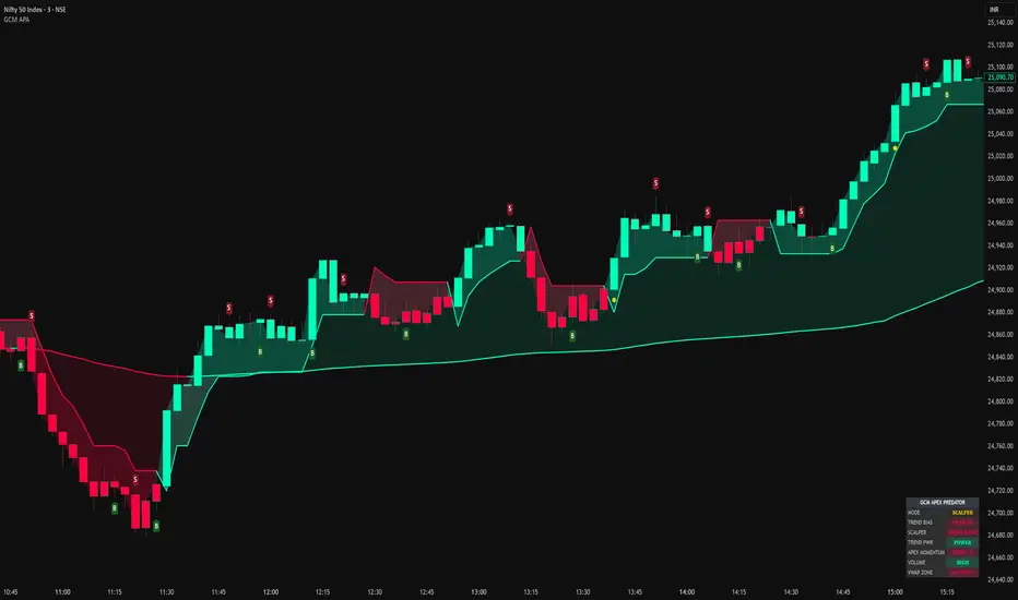 The GCM Apex Predator is a high-performance, multi-engine trading system designed for traders who demand precision and clarity. Whether you are a fast-paced scalper or a patient swing trader, this algorithm adapts to market conditions using a sophisticated "Apex Score" momentum engine combined with institutional-grade volume and trend filters.