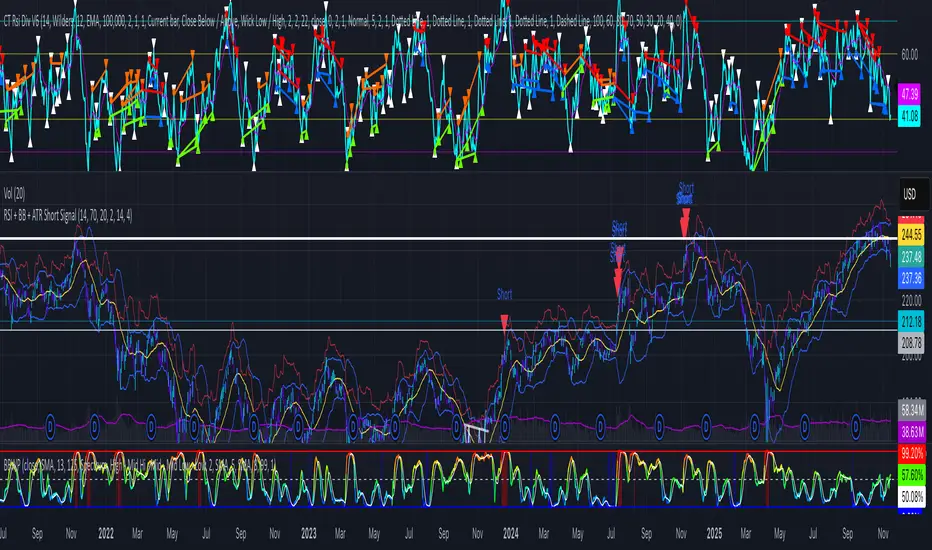 To help visualise the setup, the script also plots the full Bollinger Bands (upper, middle, lower) and a line showing the threshold of 5-day-low + ATR × multiplier. You can adjust RSI length and level, Bollinger settings, ATR length, and the ATR multiplier.