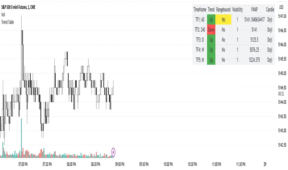The "Multi-Timeframe Trend Table" indicator is a tool that consolidates a variety of critical trading metrics into a single, easy-to-read table format. This indicator is especially useful for traders who need to analyze multiple timeframes and indicators simultaneously to make informed trading decisions. By displaying a broad spectrum of data including trend information, rangebound status, volatility levels, VWAP (Volume Weighted Average Price), and specific candlestick patterns, the indicator provides a comprehensive overview of market conditions across different timeframes.