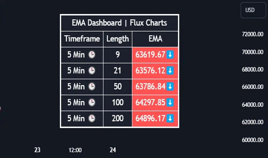 - Shows EMA Across 5 Different Lengths & Timeframes.
