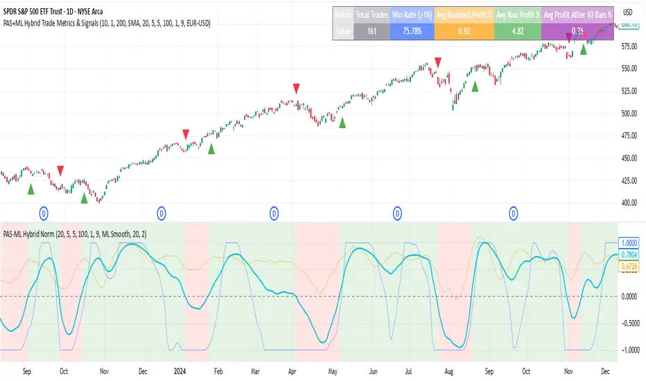 This indicator pairs with "PAS/ML Hybrid Score System Metrics & Signals", a separate tool that displays trade signals and performance metrics directly on the price chart. Use both together for a full analytical workflow.