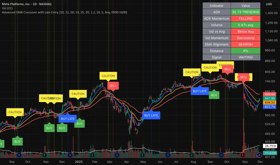 Professional-grade EMA crossover indicator for 4-hour swing trading with institutional-quality filters including ADX trend confirmation, volume analysis, and late entry signals.🔧 Core Features1. EMA Crossover Strategy