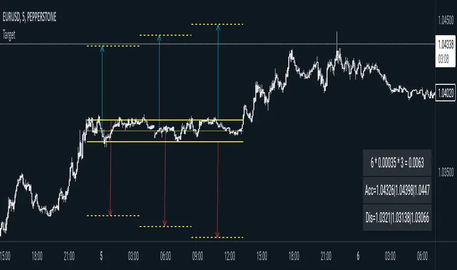 This indicator calculate the range (Cause) of Phase accumulation or distribution to calculate the taget (Effect) based on the Wyckoff Method.