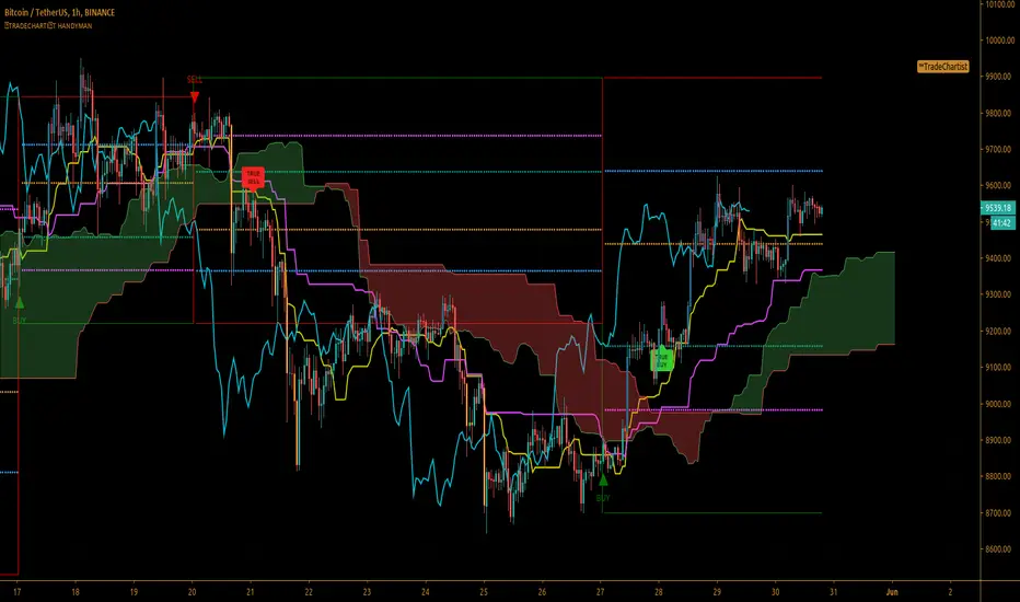 ™ᴛʀᴀᴅᴇᴄʜᴀʀᴛɪꜱᴛ ʜᴀɴᴅʏᴍᴀɴ is a well designed utility script that helps plot a few important trading indicators like Bollinger bands, EMA , Ichimoku Cloud etc. along with repainting Buy/Sell signals based on Zig-Zag (Heikin Ashi trend) which can be used cautiously with levels generated.