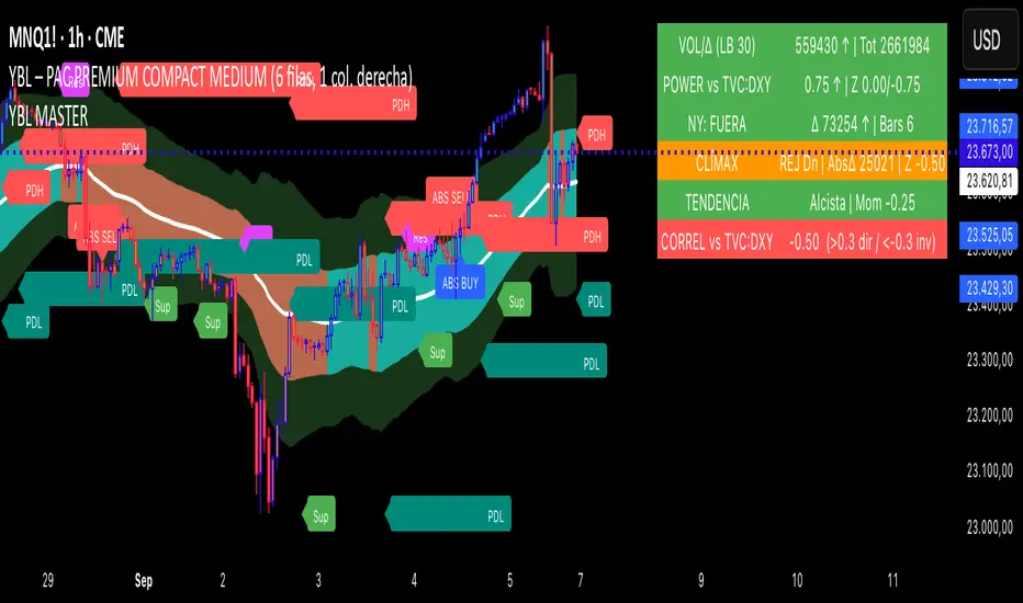EMA/VWAP hybrid cloud that changes color with bias (green = bullish, red = bearish).