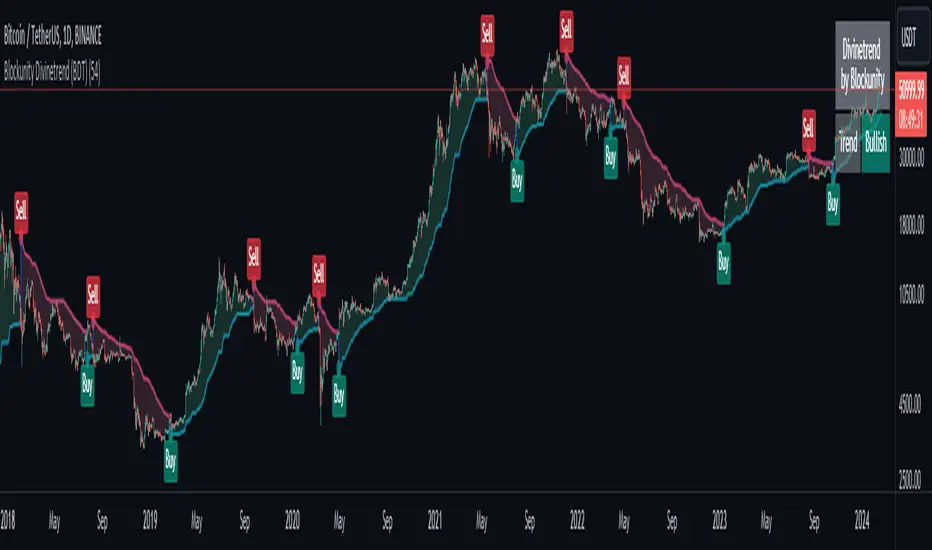 Divinetrend gives buy and sell signals based on trailing stop line breaks and trend orientation. In particular, it can be used for trend identification and following. If the Contested Trend option is activated in the settings, the indicator will also display a contested period in blue. In this case, it is necessary to wait 5 days for the trend to be validated.