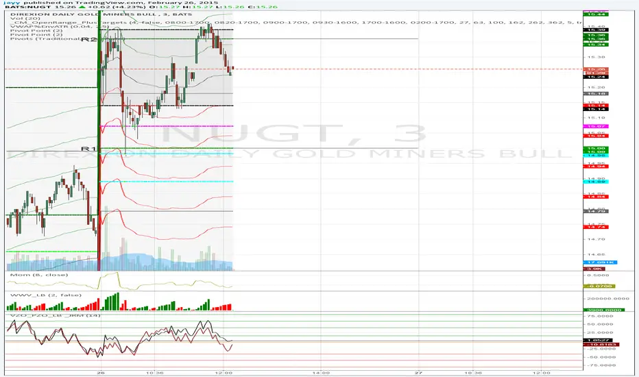 This is a simple update of Lazy Bear's " Indicators: Volume Zone Indicator & Price Zone Indicator" Script. PZO plots on the same indicator. The horizontal plot lines are taken primarily from two articles by Wahalil and Steckler "In The Volume Zone" May 2011, Stocks and Commodities and "Entering The Price Zone"June 2011, Stocks and Commodities. With both indicators on the same plot it is easier to see divergences between the indicators. I did add a plot line at 80 and -80 as well because that is getting into truly extreme price/volume territory where one might contemplate a close your eyes and sell or cover particularly if confirmed at a higher time frame with the expectation of some type of corrective move..