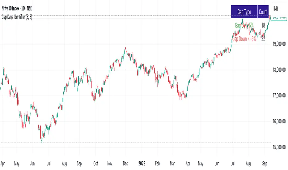 This script identifies Gap Up and Gap Down days based on user-defined percentage thresholds. It is designed for daily charts and helps traders spot significant opening gaps relative to the previous day’s close.