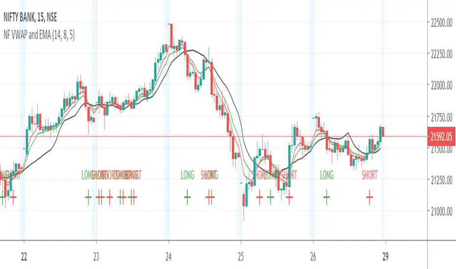 The script picks up nifty stocks with their current respective weights and plots a Volume Weighted Average Price line along with 2 EMAs and an alert when the EMAs cross over.